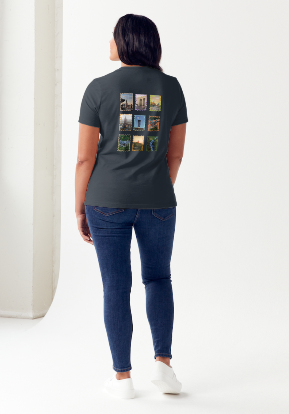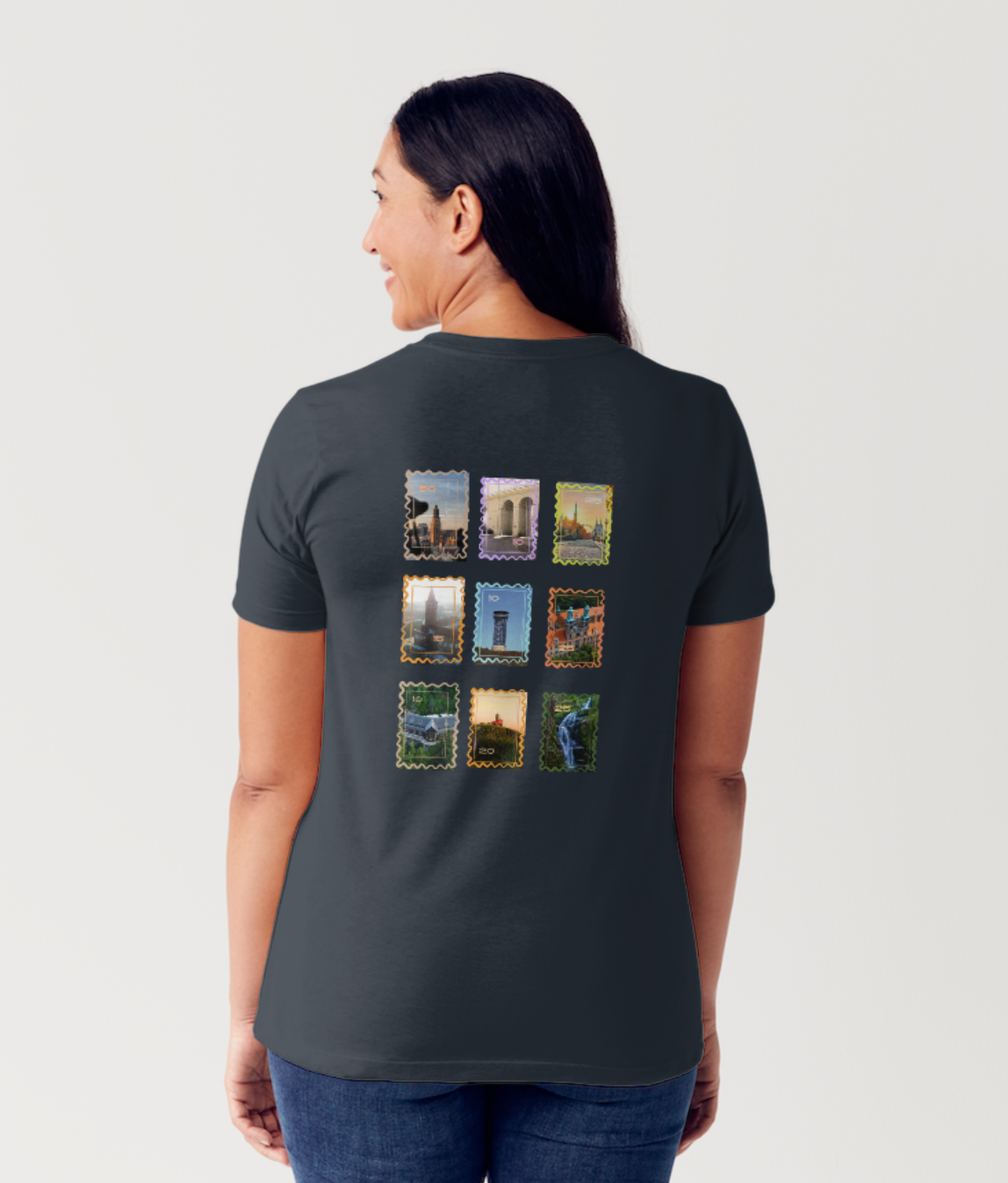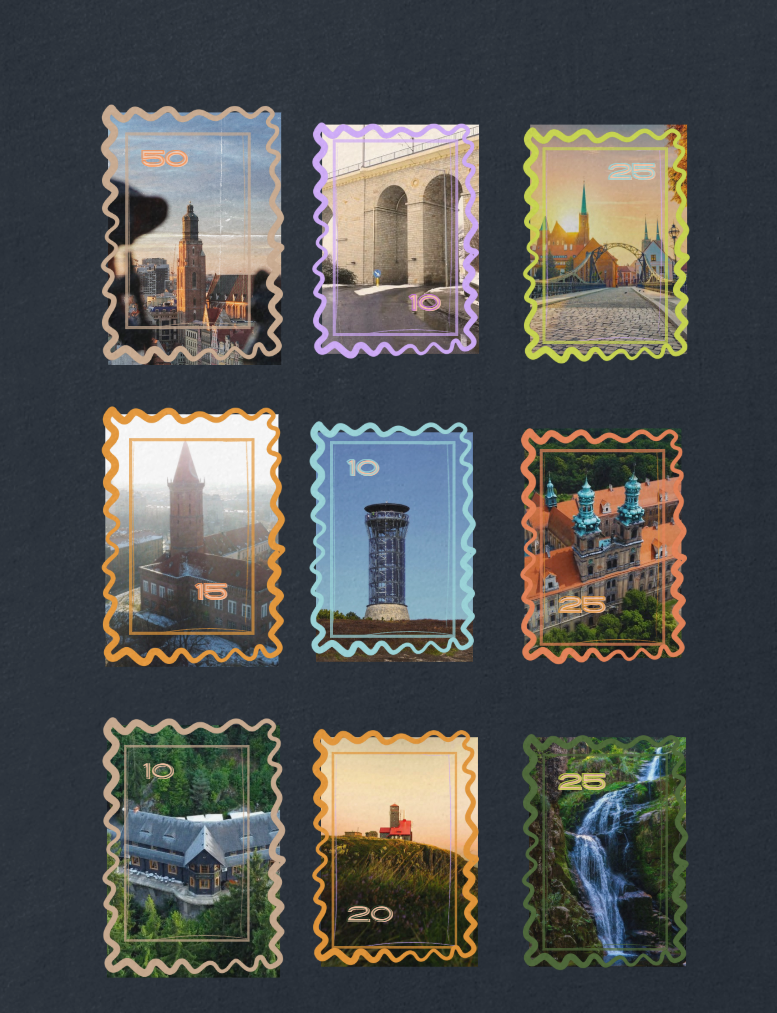 Na przodzie delikatny motyw jak z pocztówki — ciepłe światło, klimat „Pozdrowienia z Dolnego Śląska”. Na plecach cała siatka znaczków: jak album ze zdjęciami z wycieczek — mosty, wieże, zaułki, zieleń. To koszulka do noszenia na weekendowe wypady, na spotkania z przyjaciółmi i po prostu na co dzień, gdy chcesz mieć przy sobie kawałek regionu.
